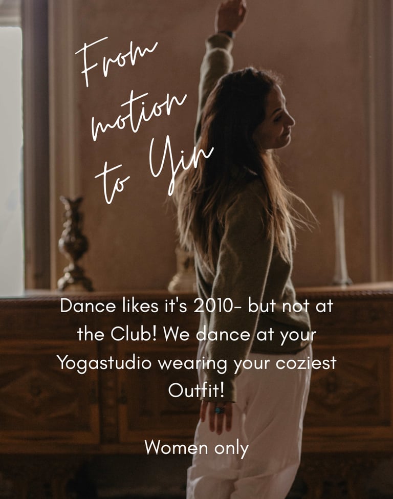 Nach dem Tanzen schließen wir ein paar wohltuende Yin Yoga Haltungen an, um unser Nervensystem zu regulieren. Du wirst mit einem wunderbar entspanntem Gefühl nach Hause gehen.